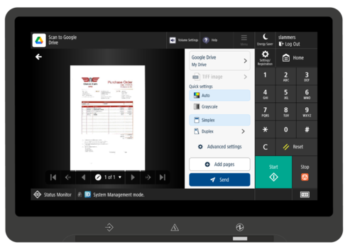 uniFLOW Online Express simplifies document scanning on Canon devices significantly. Users can scan documents directly from any connected Canon imageRUNNER ADVANCE. The lean, intuitive user interface combined with the secure ‘Scan to Myself’ and ‘Scan to Google Drive’ workflows result in immediate gains in productivity.